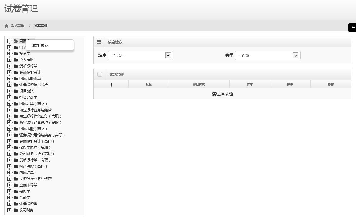 采用歷年銀行從業(yè)資格考試題目及書本或其它來源的題目為總題庫(kù)。主要功能有練習(xí)中心和考試中心。練習(xí)中心由老師設(shè)置題目,在題庫(kù)中選取,可手動(dòng)選題和隨機(jī)選題,主要用于學(xué)生平時(shí)練習(xí)。學(xué)生做完可以查看正確情況??荚囍行南扔衫蠋熢O(shè)置試卷,可設(shè)置考試時(shí)間、有效期、分?jǐn)?shù)、題目等等,也可隨機(jī)生成考卷。學(xué)生選擇考卷后開始答題,試卷題目順序隨機(jī)打亂,答題計(jì)時(shí)器在規(guī)定時(shí)間結(jié)束后自動(dòng)提交試卷。完成考試學(xué)生可查看得分情況及正確答案。軟件界面美觀、操作簡(jiǎn)便、實(shí)用有效、可以升級(jí)。