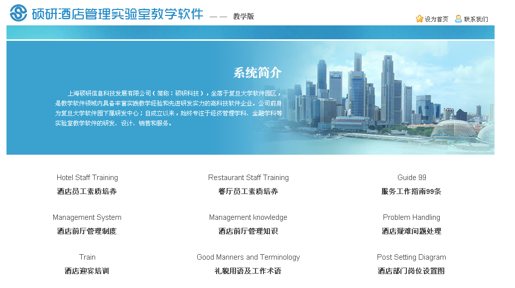 隨著商務(wù)活動(dòng)的日益頻繁,作為商務(wù)和娛樂活動(dòng)重要場(chǎng)所的酒店正在受到越來越多的社會(huì)各方的關(guān)注。而傳統(tǒng)的酒店管理模式已經(jīng)不再適用,在互聯(lián)網(wǎng)日益普及、信息化成為必然的現(xiàn)代化酒店管理中,需要的是既有理論素養(yǎng),又有現(xiàn)代化管理經(jīng)驗(yàn)的人員。基于這種情況,上海碩研信息技術(shù)有限公司組織專業(yè)人員,聽取了大量專業(yè)人士的意見和建議,經(jīng)過潛心研發(fā),推出了這套《酒店管理教學(xué)模擬系統(tǒng)》。希望通過這套系統(tǒng),給正在學(xué)習(xí)酒店管理專業(yè)的同學(xué)提供一個(gè)仿真實(shí)踐的平臺(tái),讓他們?cè)趯W(xué)習(xí)理論知識(shí)的同時(shí),通過系統(tǒng)模擬的操作,對(duì)現(xiàn)代酒店管理的理念和思想有一個(gè)直觀的了解;同時(shí),通過該軟件進(jìn)行教學(xué),可以改變傳統(tǒng)的教學(xué)模式,減輕教師的教學(xué)負(fù)擔(dān),使理論性的教學(xué)不再枯燥,提高教學(xué)質(zhì)量。